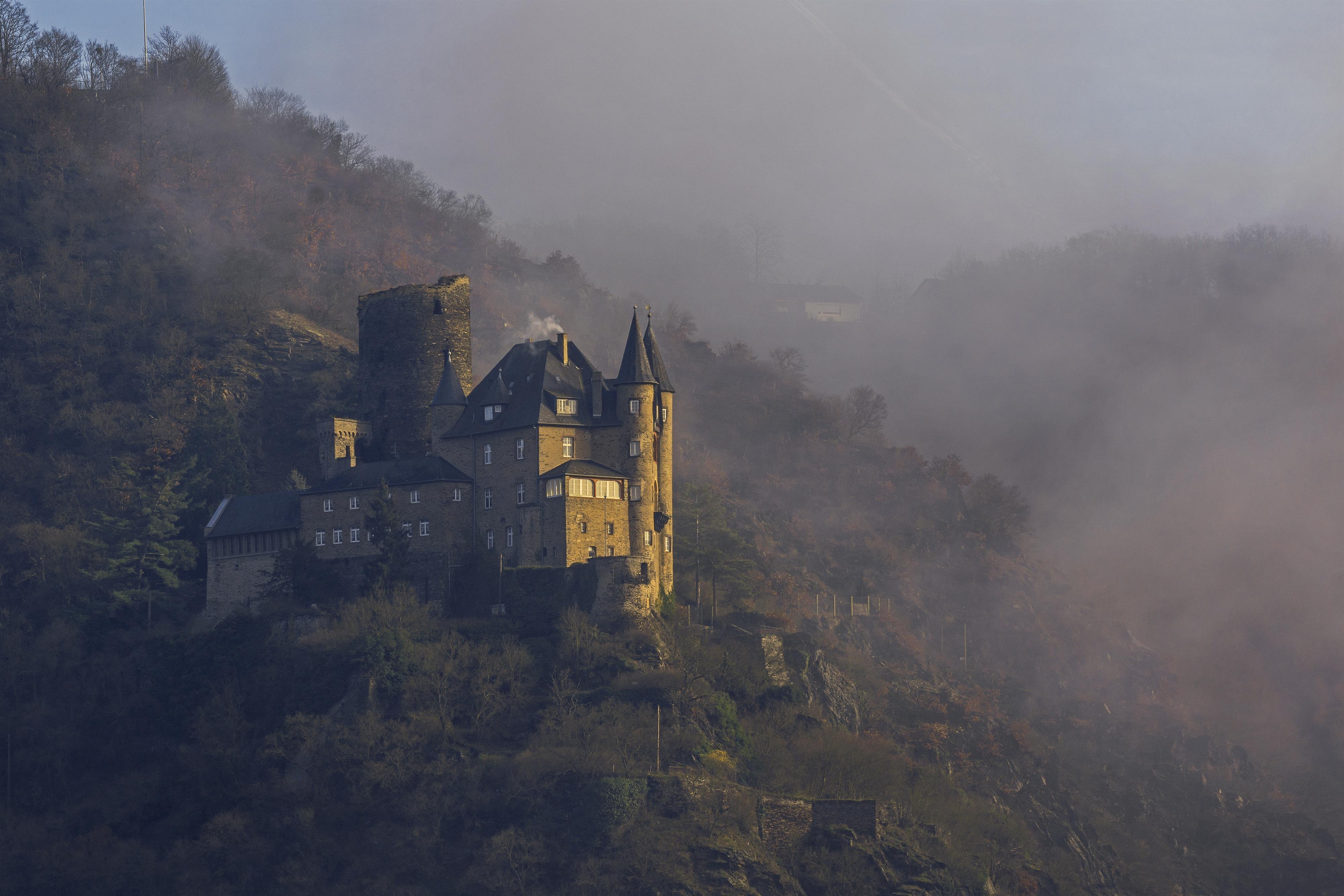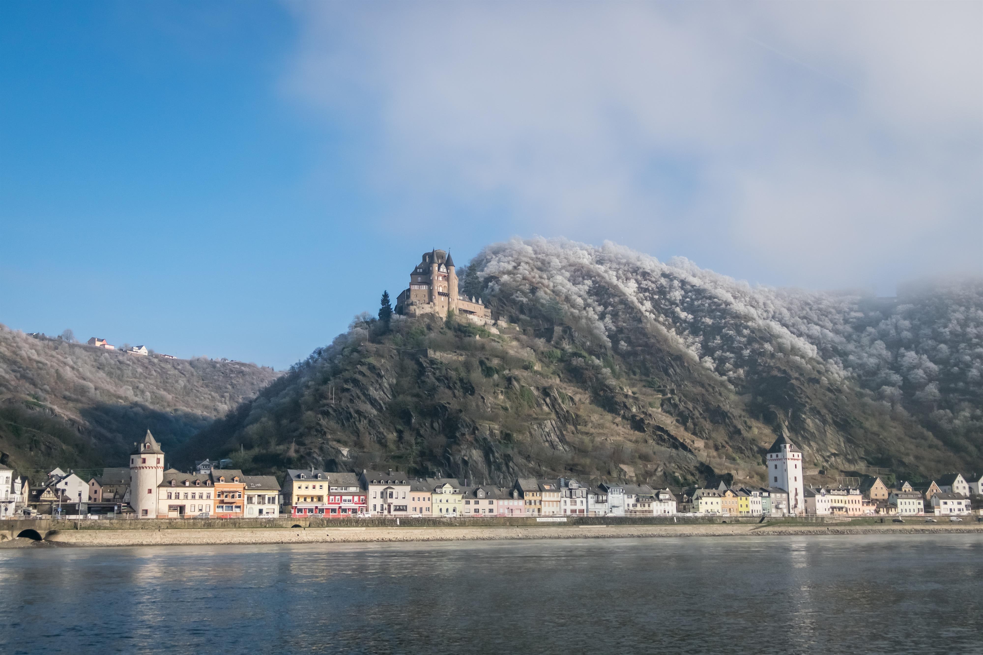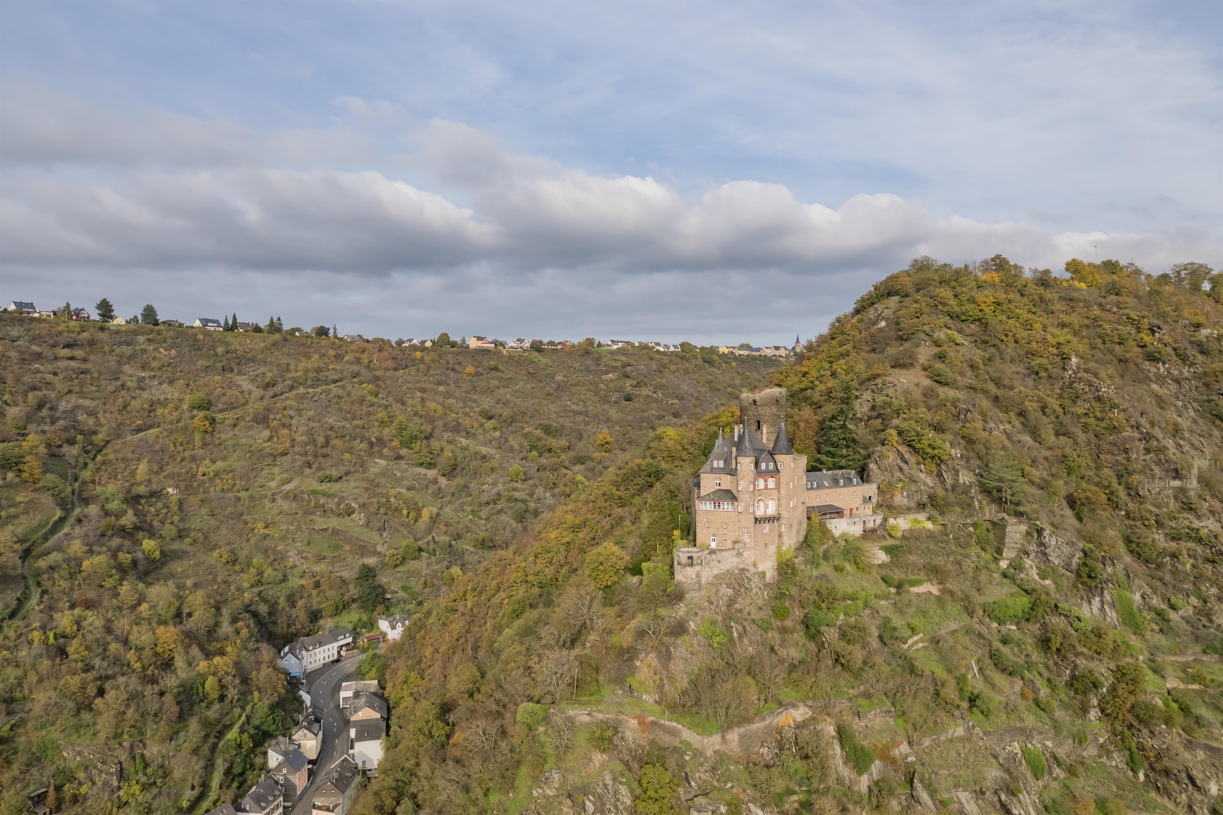 Die Bezeichnung „Katz“ hat der Burg in St. Goarshausen der Volksmund eingetragen, die 1371 eigentlich als Burg Neu-Katzenelnbogen entstanden war. Mit ihr wollten die Grafen von Katzenelnbogen ihre Besitzungen am Rhein und insbesondere die Zollstelle im gegenüberliegenden St. Goar schützen - sowie gleichermaßen bewusst ein Gegengewicht zur kurtrierer Burg „Maus“ setzen, welche ihre Zollabfertigung bedrohte. Wie viele Rheinburgen vermag sie den französischen Truppen schlussendlich nicht zu wiederstehen, die Burg wird 1806 zerstört. Es dauert fast ein Jahrhundert, ehe ein historisierender Wiederaufbau 1898 bis 1899 die Ruine zum prächtigen Wohnsitz werden lässt.